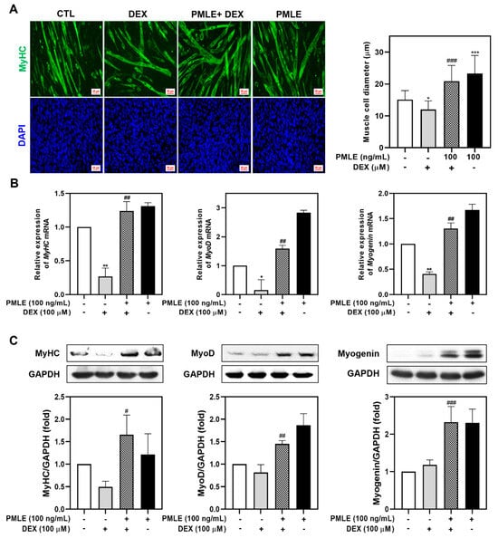Excess glucocorticoids (GCs) are known to impair muscle protein synthesis by inducing atrophy-related factors, like myostatin [,]. These effects are frequently observed in chronic disease conditions and have been associated with oxidative damage and mitochondrial dysfunction [,]. DEX, a synthetic GC, has long been used in experimental models to simulate these muscle-wasting effects []. Consequently, DEX is widely used in both in vitro and in vivo models to study muscle atrophy, making the investigation of strategies to mitigate DEX-induced muscle loss critical for potential clinical applications. In our study, treatment with 100 μM DEX significantly reduced the width of myotubes formed by differentiated C2C12 cells, a result consistent with previous reports confirming the atrophy-inducing effects of DEX []. However, the co-administration of PMLE at a concentration of 100 ng/mL effectively restored myotube width (Figure 2A). These findings indicate that PMLE enhances myotube formation by facilitating myoblast fusion, which increases myotube diameter.