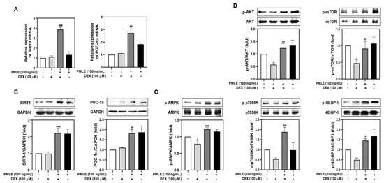 To explore the molecular mechanisms behind PMLE’s protective effects, we evaluated mitochondrial biogenesis and protein synthesis markers. Although DEX had a minimal effect on SIRT1 and PGC-1α, PMLE co-treatment led to significant upregulation of both genes and their protein products (Figure 4A,B). Next, we assessed the effects of PMLE on the AMPK signaling pathway, which is critical for mitigating mitochondrial oxidative damage in myotubes. As shown in Figure 4C, AMPK phosphorylation, slightly suppressed by DEX, was markedly elevated by PMLE. These results suggest that PMLE enhances mitochondrial biogenesis by promoting SIRT1 and PGC-1α expression through AMPK activation. Likewise, PMLE reactivated the Akt/mTOR axis, reversing the DEX-induced suppression of phosphorylated Akt, mTOR, p70S6K, and 4E-BP1 levels (Figure 4D). These findings indicate that PMLE enhances protein synthesis by activating the Akt/mTOR pathway.