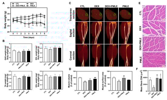 PMLE prevents DEX-induced muscle atrophy in vivo. (A) Body weight changes in mice treated with DEX (20 mg/kg) and/or PMLE (50 mg/kg) for 8 days. (B) Relative weights of GAS, SOL, TA, and EDL muscles normalized to body weight. (C) Micro-CT images (transverse, sagittal, coronal) of lower limb muscles. Green outlines indicate muscle boundaries. (D) Quantification of muscle volume and surface area (% of control). (E) H&E staining of GAS muscle cross-sections. Scale bar = 50 µm. (F) Quantitative analysis of myofiber CSA from histological images showing PMLE-mediated recovery of fiber size reduced by DEX treatment. Statistical significance: * p < 0.05, ** p < 0.01, *** p < 0.001 vs. control group; # p < 0.05, ## p < 0.01, ### p < 0.001 vs. DEX-treated group. PMLE, Pueraria montana var. lobata extract; CSA, cross-sectional area.
