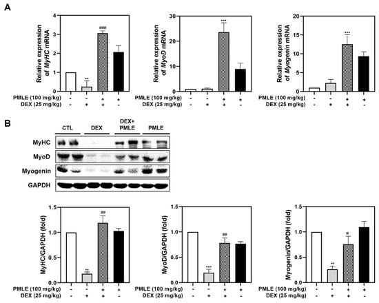 In DEX-treated mice, PMLE significantly restored MyHC mRNA expression and also elevated MyoD and myogenin levels (Figure 6A). Western blot data mirrored these findings, with PMLE rescuing the protein expression of these markers suppressed by DEX (Figure 6B). These findings suggested that PMLE effectively counteracted DEX-induced muscle atrophy in mice by upregulating the expression of myogenesis-associated markers.