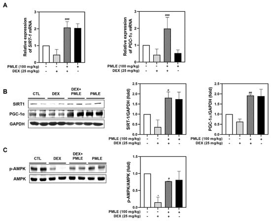 In vivo analyses confirmed that PMLE enhanced the expression of mitochondrial biogenesis regulators. Both mRNA and protein levels of SIRT1 and PGC-1α were upregulated following PMLE treatment (Figure 7A,B). PMLE also significantly increased AMPK phosphorylation in skeletal muscle, corroborating its mitochondrial regulatory role observed in vitro (Figure 7C). These findings, consistent with the in vitro results, suggest that PMLE promotes mitochondrial biogenesis by upregulating SIRT-1 and PGC-1α expression through AMPK activation.