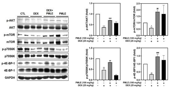 DEX treatment suppressed phosphorylation of critical protein synthesis mediators—Akt, mTOR, p70S6K, and 4E-BP1—without affecting total protein levels. PMLE effectively reversed these changes, restoring phosphorylation levels and suggesting a recovery of anabolic processes (Figure 8).