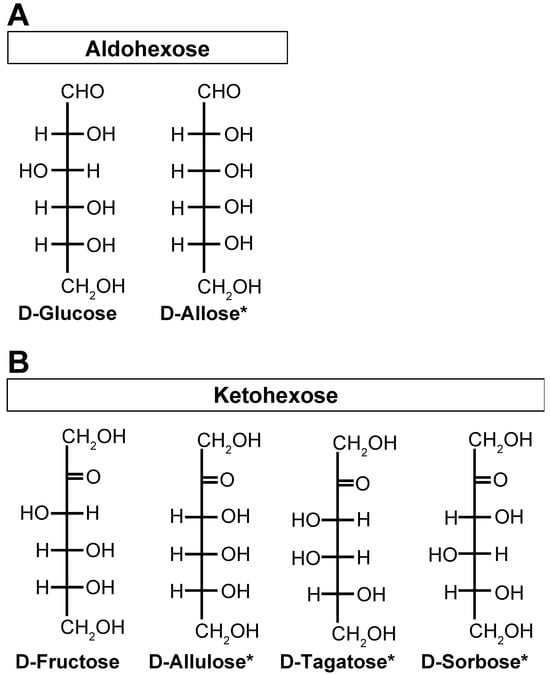 Chemical structures of the monosaccharides/hexoses investigated in this study: four rare sugars and two nonrare sugars. D-glucose and D-allose are aldohexoses that contain an aldehyde group (A). D-fructose, D-allulose, D-tagatose, and D-sorbose are ketohexoses that contain a ketone group (B). Of these, D-allose, D-allulose, D-tagatose, and D-sorbose are rare sugars, indicated by an asterisk (*).
