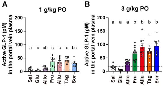Comparison of plasma active GLP-1 concentrations after administration of six monosaccharides: All ketohexoses, except aldohexoses, promote GLP-1 secretion. Overnight-fasted C57BL/6J mice received monosaccharide solutions at either 1 g/kg (A) or 3 g/kg (B) via a stainless-steel feeding needle directly into the stomach. Blood samples were collected from the portal vein 1 h after administration, and plasma active GLP-1 concentrations were measured. The dashed lines in (A,B) represent the mean value of the saline group. n = 5–15. Different letters indicate significant differences with p < 0.05 determined by one-way ANOVA followed by Tukey’s test. GLP-1: glucagon-like peptide-1. Sal: saline. Glu: D-glucose. Allo: D-allose. Fru: D-fructose. Allu: D-allulose. Tag: D-tagatose. Sor: D-sorbose.