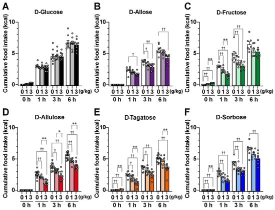 Single peroral administration of rare sugars or ketohexoses suppresses food intake. Mice were fasted overnight (16 h) and then perorally administered either saline or a monosaccharide solution ((A) D-glucose, (B) D-allose, (C) D-fructose, (D) D-allulose, (E) D-tagatose, (F) D-sorbose) at doses of 1 g/kg or 3 g/kg. The mice were fed immediately after administration, and cumulative food intake was measured at 1 h, 3 h, and 6 h after administration. The energy values of the administered solutions are indicated at 0 h in each figure; cumulative food intake includes the energy from the administered monosaccharides. n = 7–16. † p < 0.05, †† p < 0.01 by one-way ANOVA followed by Dunnett’s test compared to the saline po group. * p < 0.05, ** p < 0.01 by one-way ANOVA followed by Tukey’s test for comparisons between 1 g/kg and 3 g/kg.