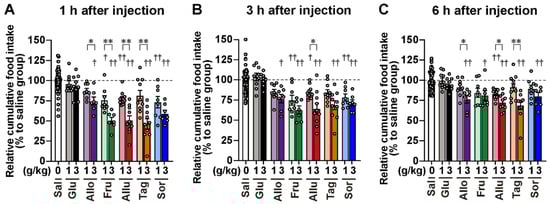 Comparison of the anorexigenic effects of monosaccharides. The data on cumulative food intake after administration of the six monosaccharides shown in Figure 3 were reanalyzed as relative cumulative food intake at 1 h (A), 3 h (B), or 6 h (C) after injection. The saline group was included in all experiments conducted on different days. Therefore, the cumulative food intake after monosaccharide administration was normalized to the saline group results from the same day. The dashed lines in each figure indicate the average value of the saline group. n = 104 for the saline group and n = 7–11 for other groups. † p < 0.05, †† p < 0.01 by the Kruskal–Wallis test followed by Dunn’s test vs. the saline group. * p < 0.05, ** p < 0.01 by the Mann–Whitney test. Sal: saline, Glu: D-glucose. Allo: D-allose. Fru: D-fructose. Allu: D-allulose. Tag: D-tagatose. Sor: D-sorbose.