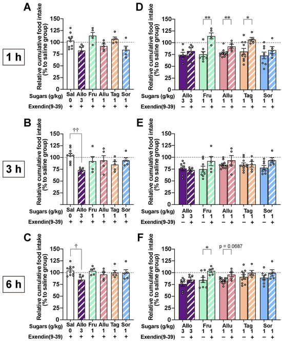 Pretreatment with GLP-1 receptor antagonist exendin(9–39) blunts the anorexigenic effects of ketohexose administration but not those of D-allose. (A–C) Exendin(9–39) at 600 nmol/kg was administered intraperitoneally to overnight-fasted mice 15 min before administration of either saline or monosaccharides (3 g/kg: D-allose; 1 g/kg: D-fructose, D-allulose, D-tagatose, and D-sorbose). Cumulative food intake was measured at 1 h (A), 3 h (B), and 6 h (C) after administration. These experiments were performed over multiple days; therefore, the results are presented as relative cumulative food intake (% kcal relative to the saline group). (D–F) To compare the effects of exendin(9–39), the results from Figure 5A–C and Figure 4 were reanalyzed for each time point. † p < 0.05, †† p < 0.01 by Kruskal–Wallis test followed by Dunn’s test vs. saline group. * p < 0.05, ** p < 0.01, and p = 0.068 by Mann–Whitney test between the two groups. Sal: saline, Glu: D-glucose. Allo: D-allose. Fru: D-fructose. Allu: D-allulose. Tag: D-tagatose. Sor: D-sorbose.