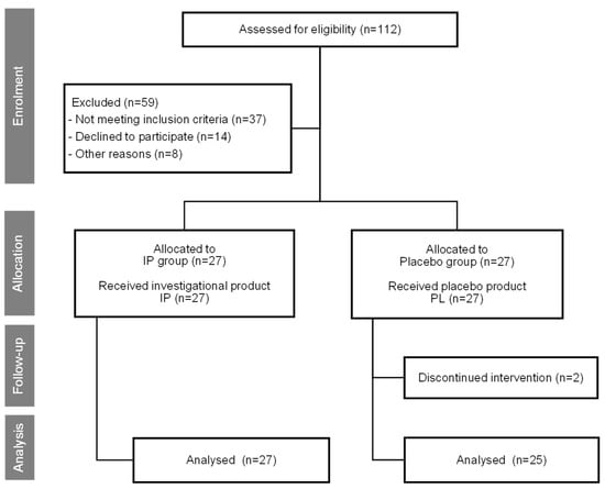 Out of the 54 subjects enrolled in the study, 52 completed the entire 8-week trial (placebo group: 25 subjects (22 female, 3 male), IP group: 27 subjects (24 female, 3 male). There were 2 drop-outs, both in the placebo group, due to personal reasons. One participant from the IP group was unable to return to the study center for T2 visits due to personal reasons. Both arms demonstrated good compliance with the protocol, as evidenced by the subjects’ diaries of test product intake. There were no adverse effects reported in either of the two research groups, and the supplementation was well tolerated. Trial design and the passage of subjects through the trial are presented in the Consolidated Standards of Reporting Trials (CONSORT) flow diagram in Figure 1.