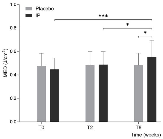 Minimal erythema dose (MED) at baseline (T0) and at follow-ups after 2 (T2) and 8 (T8) weeks of intervention. Error bars represent standard deviation, and the results of intergroup and intragroup statistical analyses are reported above the bars (* p < 0.05, *** p < 0.001).