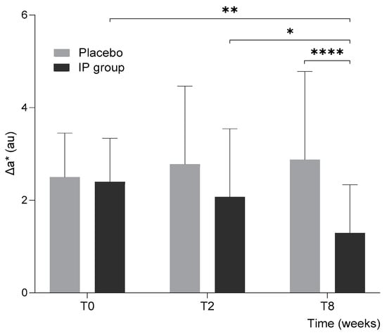 The UV-induced skin redness (Δa*) 24 h after irradiation for the placebo and IP groups at baseline (T0), after 2 (T2), and 8 weeks (T8) of intervention. Error bars represent standard deviation, and the results of intergroup and intragroup statistical analyses are reported above the bars (* p < 0.05, ** p < 0.01, **** p < 0.0001).