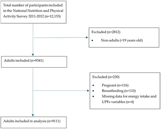In this study, participants were excluded from the analysis if they were less than 19 years of age (n = 2812), pregnant (n = 116), breastfeeding (n = 110), or missing data for any variables required for analysis (n = 4 missing data for UPF intake). The cut-off age of 19 years for exclusion from the adult population was chosen to be consistent with age groups used in the reporting by the Australian Bureau of Statistics [32], the Australian Institute for Health and Welfare [33], and the Australian Nutrient Reference Values [34]. A total of 9111 subjects were included in this study (Figure 1). The study results are reported using the Strengthening the Reporting of Observational Studies in Epidemiology—Nutritional Epidemiology (STROBE-nut) reporting guidelines (Supplementary Table S1) [35].