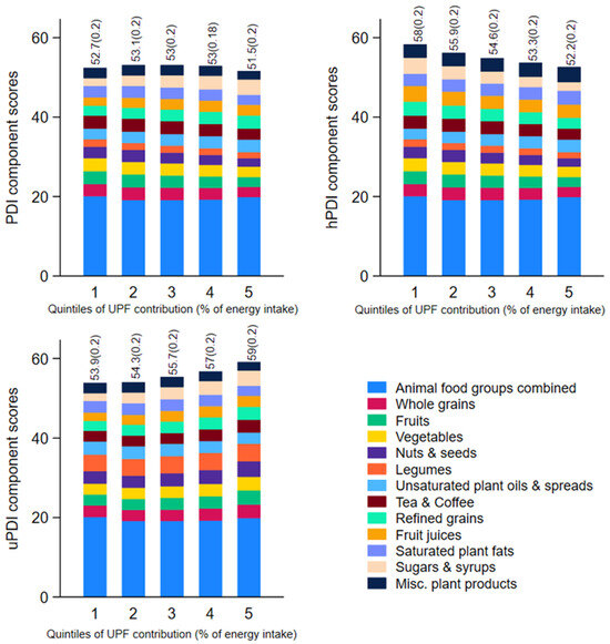 The mean (SE) scores for PDI, uPDI, and hPDI, as well as the component scores for each index, according to quintiles of energy from UPFs, are shown in Figure 2. Component scores are also presented in Supplementary Table S3. The greatest difference in the mean (SE) component scores from the first to the fifth quintile of UPFs was for the sugars and syrups group. For PDI and uPDI this ranged from 2.0 (0.03) to 3.8 (0.04), whereas for hPDI this ranged from 4.0 (0.04) to 2.2 (0.04). The second greatest difference across quintiles of UPFs was the nuts and seeds food group, where the mean (SE) component score for PDI and hPDI ranged from 3.0 (0.05) to 2.1 (0.05) and for uPDI from 3.1 (0.06) to 3.9 (0.05). The third greatest difference across quintiles of UPFs was observed in refined grains: mean (SE) component score for PDI and uPDI ranged from 2.6 (0.05) to 3.4 (0.04) and for hPDI this ranged from 3.4 (0.05) to 2.6 (0.04), followed by fruits and vegetables group (Supplementary Table S3).