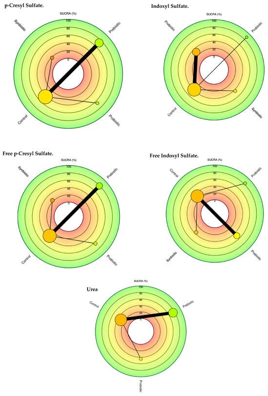 In relation to the use of probiotics, there was a decrease in uremia toxins with SUCRA values for total IS (88.5%), free IS (83%), including intervention for the use of prebiotics for p-CS (72.4%), free IS (78.9%), and finally, urea (74.6%).