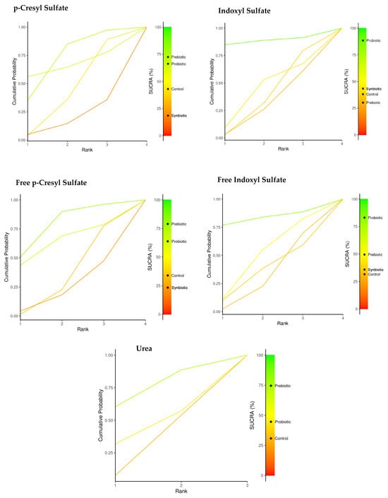 Table 2 summarizes the comparisons of the SUCRA values and provides a relative classification of immunonutrition (probiotics, prebiotics, and synbiotics) for each of the uremic toxins. The plots of the area under the curve for each uremic toxin are found in Figure 3.