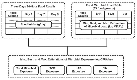 To estimate the number of food microbial intake of the study population, the average food intake in grams or ml was calculated based on the three 24-HDRs. This intake was then multiplied by the estimated microbial load of each food, as obtained from the microbial composition table (CFU/g) for TCB, LAB, and YM. These microbial loads were applied for the minimum, best, and maximum estimates. The total microbial intake was calculated by summing the contributions from all foods (Figure 1).