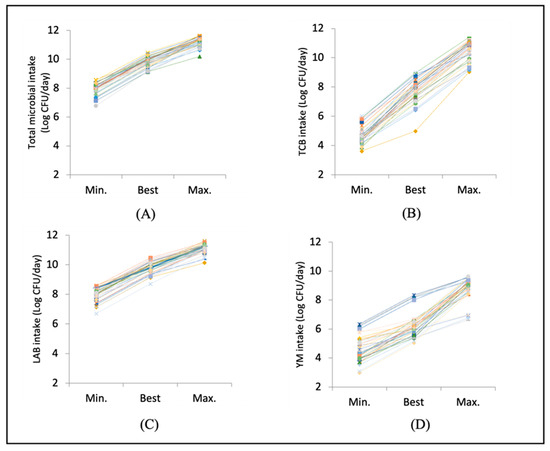 Ranges in interindividual total food microbial intake (A), TCB (B), LAB (C), and YM (D) per day, as estimated from the average values of three 24 h HDRs (n = 34, all 34 individuals shown in different line/colour/symbol) and presented for minimum, best, and maximum intakes.