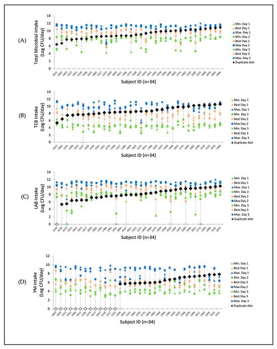 Estimated intake from 24 h dietary recalls of each study participant (n = 34) of total food microbes (A), TCB (B), LAB (C), and YM (D) and the measured intake of 1-day duplicate portion per person. The intraindividual range of estimated intake of days 1, 2, and 3 is presented with minimum levels (green), best levels (pink), and maximum levels (blue). The measured intake from 1-day duplicate portions is presented by black diamonds (open diamonds represent results below the detection limit around 4 log CFU/g).