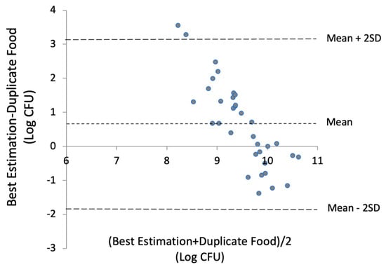 The Bland–Altman plot (Figure 4) displays the average of the best estimates and the measurement in duplicate portions against the difference between the two methods. The Figure 4 shows that, on average, the best estimated total microbial exposure was 0.6 log CFU higher than values determined by plate counting of the duplicate foods. Lower estimates tended to overestimate microbial content, while higher estimates seemed to underestimate it. The limits of agreement ranged from +3 to −2 log (CFU).