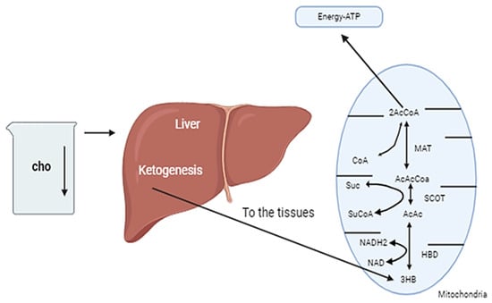 Fatty acids (FFAs) are unable to cross the blood–brain barrier, making glucose the dominant energy substrate for the brain. According to seminal investigations [18], a reduction in carbohydrate intake for a period of three to four days results in the central nervous system (CNS) utilizing alternative energy sources, namely ketone bodies (KBs). Ketone bodies represent an efficient alternative energy source during prolonged fasting or carbohydrate deprivation. They are synthesized through the process of ketogenesis, which is driven by an excess of acetyl-CoA and a concurrent reduction in oxaloacetic acid. This group comprises acetone, 3-hydroxybutyrate (3HB), and acetoacetate (AcAc: 18), all of which are ketone bodies. As shown in Figure 2 the majority of ketogenesis occurs within the mitochondrial matrix of the liver [19]. The liver is capable of synthesizing ketone bodies (KBs), yet lacks the requisite enzyme succinyl-CoA. 3-CoA transferase (SCOT) is essential for the conversion of acetoacetate into acetoacetyl-CoA, thereby preventing its utilization within the liver itself [20]. The most prevalent ketone in the bloodstream is 3-hydroxybutyrate, while the primary ketone produced in the liver is acetoacetate. Tissues such as the heart and skeletal muscle are capable of metabolizing small quantities of free acetoacetic acid, which is naturally produced in minute amounts. Large quantities of acetoacetic acid are produced, resulting in elevated levels that exceed the normal range. This is followed by conversion into the other two ketone bodies. As ketone bodies are excreted via the renal excretion system, they can be detected in both the blood (ketonemia) and urine (ketonuria). In conditions deemed normal, the concentration of ketone bodies (KBs) is less than 0.3 mmol/L, a figure that is considerably lower than that of glucose [21]. The CNS begins to utilize KBs as an alternative energy source when blood concentration levels reach approximately 4 mmol/L, which is in close proximity to the Km for the monocarboxylate transporter. The generation of energy by the body occurs through the conversion of ketone bodies (KBs) into acetoacetyl-CoA, a process initiated by the transformation of 3HB into AcAc [22]. It is intriguing to postulate that ketone bodies (KBs) may be capable of providing a greater quantity of adenosine triphosphate (ATP) than glucose. This is due to the fact that KBs have been observed to enhance mitochondrial efficiency in ATP production [23].