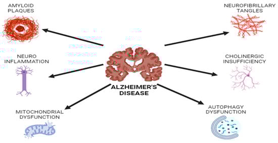 The biology of Alzheimer’s disease includes the basic biological processes and mechanisms that contribute to the disease’s appearance and advancement. The various factors that contribute to Alzheimer’s disease progression are shown in Figure 1. Amyloid plaques and hyperphosphorylated tau are the main factors that play a role. The development of senile plaques is facilitated by extracellular amyloid formation. The cytoskeleton and signal transmission in neural cells are disrupted by hyperphosphorylated tau, which also causes microtubules to break down. Neuroinflammation, oxidative stress, acetylcholine weakness, mitochondrial dysfunction, and autophagy failure all greatly contribute to the progression of the condition.