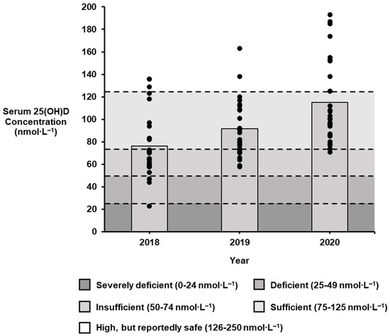 Seven percent (2 of 29) of swimmers had a deficient vitamin D status in 2018, including one individual that was classified as severely deficient (23 nmol∙L−1). This was the only year that vitamin D deficiency was observed across the sampling timeframe with all remaining 25(OH)D concentrations ≥ 50 nmol∙L−1 in 2019 and 2020 (Table 2). Insufficient 25(OH)D concentrations more than halved on a yearly basis, with 55% (n = 19) identified in 2018, 31% (n = 9) in 2019, and 7% (n = 2) in 2020. Similarly, the highest recorded 25(OH)D concentration increased each year from 136 nmol∙L−1 in 2018 to 163 nmol∙L−1 in 2019, and finally 193 nmol∙L−1 in 2020.