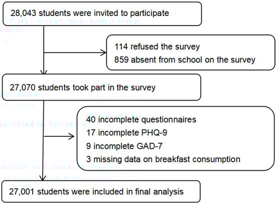 APA StyleWang, H., Guan, Y., Du, H., Dai, P., Zhong, J., Yu, M., & Li, N. (2025). Association of Breakfast Consumption Frequency with Depression and Anxiety Symptoms Among School Students: A Cross-Sectional Study in Eastern China. Nutrients, 17(7), 1271. https://doi.org/10.3390/nu17071271
