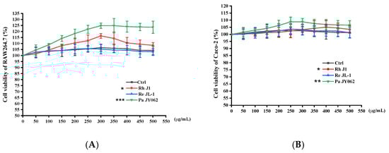 Dose-dependent effects of postbiotics on cellular viability after 24 h treatment. (A) Viability of RAW264.7 macrophages; (B) viability of Caco-2 intestinal epithelial cells. Postbiotics were tested at concentrations of 50–500 μg/mL. Data represent mean ± SD (n = 5 biological replicates). Statistical significance versus untreated controls: * p < 0.05, ** p < 0.01, *** p< 0.001.