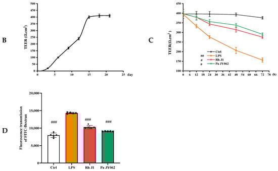 To further analyze the effects of postbiotics on intestinal barrier integrity, paracellular permeability was assessed by measuring FITC-dextran across Caco-2 monolayers. As shown in Figure 3D, both Rh J1 and Pa JY062 significantly attenuated LPS-induced barrier disruption, with Pa JY062 demonstrating the most potent protective efficacy (p < 0.01).
