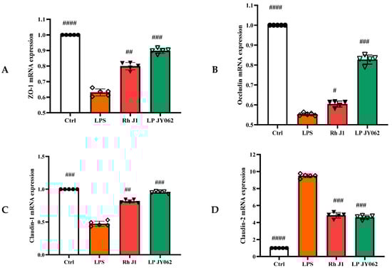 The effect of postbiotics on the relative mRNA expression of tight junctions (ZO-1, occludin, claudin-1, and claudin-2) and adhesive junctions (E-cadherin, α-catenin, and β-catenin) in LPS-induced intestinal epithelial barrier dysfunction. (A) ZO-1; (B) occludin; (C) claudin-1; (D) claudin-2; (E) E-cadherin; (F) α-catenin; and (G) β-catenin. The values are expressed as the mean ± SD (n = 5); # p < 0.05, ## p < 0.01, ### p < 0.001, and #### p < 0.0001 vs. the LPS. Different shapes in the figure represent different samples, and the same shape represents a repetition of the sample.