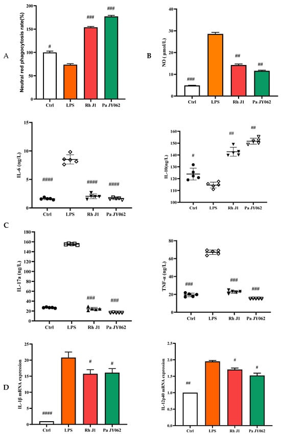 The influence of postbiotics on intestinal inflammation. (A) The impact of postbiotics on RAW264.7 cells based on the rate of neutral red phagocytosis. (B) The impact on the NO content of postbiotics. (C) The impact of postbiotics on RAW264.7 cells based on the contents of IL-6, IL-10, IL-17a, and TNF-α. (D) The impact of postbiotics on the mRNA expression of IL-1β, IL-12p40, IL-23p19, and TGF-β. The values are expressed as the mean ± SD (n = 5); # p < 0.05, ## p < 0.01, ### p < 0.001, and #### p < 0.0001 vs. the LPS. Different shapes in the figure represent different samples, and the same shape represents a repetition of the sample.