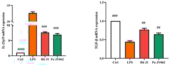 The compromise of the intestinal barrier resulted in immune dysfunction within the gut, consequently exacerbating the onset of intestinal inflammation. To provide a more comprehensive understanding of the influence of postbiotics on intestinal health, we employed a co-culture model of Caco-2 and RAW264.7 cells to investigate the effects of postbiotics on the interplay between intestinal epithelial cells and immune cells. Pa JY062 significantly improved the phagocytic ability (p < 0.001, Figure 6A) and reduced the production of NO (p < 0.01, Figure 6B) in RAW264.7 compared to the LPS group. Pa JY062 reduced the contents of IL-6, IL-17a, and TNF-α and enhanced the content of IL-10 (Figure 6C). Pa JY062 reduced the mRNA expression of IL-1β, IL-12p40, and IL-23p19 while increased the mRNA expression levels of TGF-β (Figure 6D).