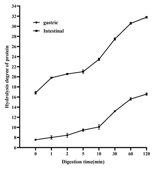 The degree of hydrolysis of PaJY062 gradually increased in gastric juice over a period of 0 to 120 min (an increase of 9.02%), whereas it rose by 14.94% in intestinal juice, suggesting that PaJY062 can be effectively utilized, particularly in the intestine (Figure 7). Good protein hydrolysis resulted in the production of more easily digestible small peptides and amino acids (see the ingredients of Pa JY062 for details).
