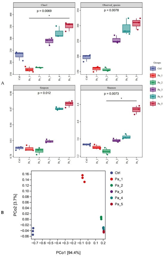 Gut microbe samples treated with 1, 2, 3, 4, and 5 mg/mL of PaJY062 were separately placed into centrifuge tubes and then introduced into centrifuge tubes containing the extraction lysate, and DNA was procured using the DNA Kit (D5635-02) (Omega Bio-Tek, Norcross, GA, USA). The V3-V4 segment of the gut microbes 16S rRNA gene was amplified through PCR. PCR products were quantified with the Quant-iT PicoGreen dsDNA Assay Kit and subsequently combined based on the necessary quantity for each sample. Illumina TruSeq Nano DNA LT Library Prep Kit (Personal Biotechnology, Shanghai, China) was employed to obtain library preparation. In the QIIME2 software, the number of sequences extracted at each depth and their corresponding ASV numbers were plotted to draw a rarefaction curve, depicting the microbial diversity within the community sample. Beta diversity analysis was conducted utilizing the UniFrac distance metric with R software and QIIME2 software to explore variations in microbial community structure across samples.