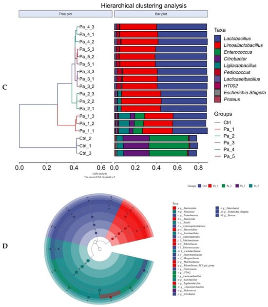 To identify the specific groups that were significantly influenced by PaJY062, linear discriminant analysis (LDA) and LDA Effect Size (LEfSe) analysis were performed, with the results presented in Figure 8D,E. The LDA score bar positively correlates with the relative abundance of discriminative bacterial taxa. It was observed that the abundance of Ligilactobacilus, Limosilactobacillus, Lactobacillaceae, Lactobacillaceae, and Lactobacillus increased with the addition of PaJY062.