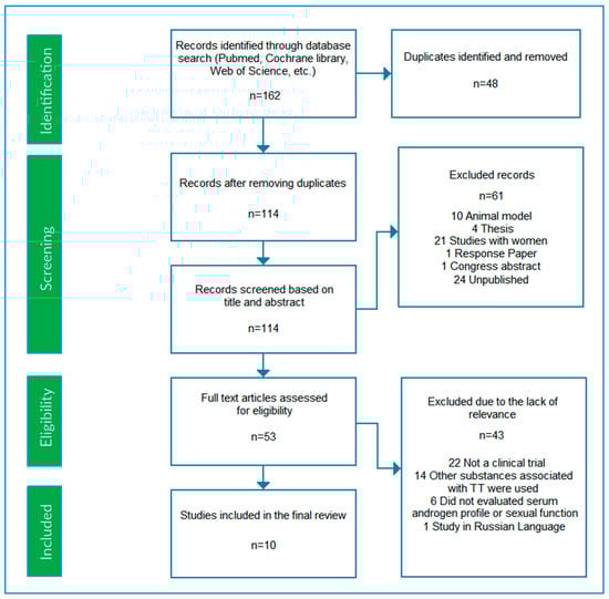 Thus, 52 studies remained for a complete reading. After reading and fully analyzing these 52 studies and considering the inclusion and exclusion criteria (Table 2), 43 studies were excluded for the following reasons: (i) study design was not a clinical trial in 22 studies; (ii) other drugs or substances were administered along with TT in 14 studies; (iii) 6 studies did not evaluate serum androgen profile or sexual function, and (iv) 1 study was in the Russian language. Finally, 10 studies were qualified and selected for the presented systematic review (Figure 1).