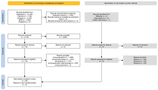 A structured search strategy was formulated a priori using the PICOS criteria [,,], and the search keywords were “parenteral nutrition”, “fish oil”, “lipids”, “emulsion”, and “randomised controlled trial”. No restrictions or filters were used, with an inclusion time interval prior to 30 September 2024. Medline (PubMed interface), Embase, and Web of Science were searched using search strings modified to fit each database’s requirements (Table S1). The results were combined to create a core database, eliminating duplicate records. Manual searches of included study reference lists were performed, along with reviews and meta-analyses on the subject, and any additional RCTs identified were added to the core database.