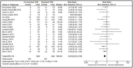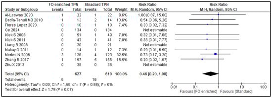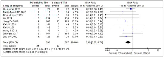 Out of the 29 included studies, 10 (1117 patients) distinguished between infection rate and the occurrence of sepsis, reporting both percentages independently. Compared to NF-PN, FO-PN significantly reduced the risk of sepsis by 51% (RR 0.49, 95% CI 0.32–0.74; p = 0.0009) (Figure 5). No subgroup analysis was performed as heterogeneity was low (I2: 0%). Meta-analyses were not performed on hospital readmissions as only one study reported this outcome.