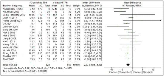 Length of hospital stay reports were found for 18 studies (1642 patients). The results showed a reduction in the length of hospital stay of 2.03 days (95% CI 1.23–2.84; p < 0.00001) with FO-PN (Figure 4). As the data for length of stay outcomes were classified as highly heterogeneous (I2 = 53%), subgroup analyses and meta-regression were performed. The subgroup analyses showed a significantly greater reduction in length of hospital stay for 8 total PN studies (680 patients) including fish oil (3.46 days; 95% CI 2.09–4.83) than for 10 PN studies (962 patients) including fish oil (1.29 days; 95% CI 0.46–2.13), with a significant (p = 0.008) test for differences between groups. (Note that ‘total PN’ studies were defined as those excluding any use of enteral and/or oral nutrition, whereas in ‘PN studies’, enteral and/or oral nutrition could contribute up to 30% of total calories supplied.) Thus, total PN may be associated with the observed reduction in the length of hospital stays for patients receiving omega-3 fatty acids. A similar subgroup analysis by oncological status did not reveal a significant difference (p = 0.4), meaning that the observed reduction in length of hospital stay might not be associated with the presence of an oncological diagnosis. Likewise, no association was observed when analyzing malnourished vs. non-malnourished subgroups (p = 0.75). Meta-regression for all predefined covariates showed that the best model describing heterogeneity includes both the proportion of males and total PN as these two covariates explain almost two-thirds of the between-study variance, with the I2 reducing from 53% to 30%. Residual unexplained heterogeneity may relate to the differences in patient characteristics and study procedures.