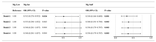 Participants were categorized into three groups according to the daily Mg intake: low (Mg-Low; <120 mg/day; reference group), intermediate (Mg-Int; 120−400 mg for males and 120−300 mg for females), and sufficient intake (Mg-Suff; ≥400 mg for males and ≥300 mg for females). The criteria for group differentiation were based on the recommended dietary allowances outlined by the National Institutes of Health [16].