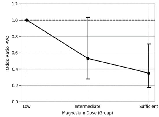 In the unadjusted model, higher levels of Mg intake were progressively associated with a reduced RVO risk compared to that of the Mg-Low group (Mg-Int: OR 0.51, 95% confidence interval [CI] 0.28–0.95, p = 0.034; Mg-Suff: OR 0.32, 95% CI 0.17–0.61, p = 0.001; model 1; Figure 2). The relationship between increased Mg intake levels and a progressive reduction in RVO risk remained consistent after adjustment for sex, age, and body mass index (Mg-Int: OR 0.55, 95% CI 0.30–1.03, p = 0.063; Mg-Suff: OR 0.37, 95% CI 0.19–0.71, p = 0.003; model 2; Figure 2), as well as after further adjustment for alcohol consumption and smoking, hypertension, DM, dyslipidemia, CKD, and polycythemia (Mg-Int: OR 0.54, 95% CI 0.28–1.04, p = 0.064; Mg-Suff: OR 0.36, 95% CI 0.18–0.71, p = 0.003; model 3; Figure 2). Even after further adjustment for nutrient intake, the association between Mg intake and reduced RVO risk persisted (Mg-Int: OR 0.54, 95% CI 0.28–1.04, p = 0.064; Mg-Suff: OR 0.36, 95% CI 0.18–0.71, p = 0.003; model 4; Figure 2). In the final adjusted model, age (OR 1.03, 95% CI 1.01–1.05, p < 0.002), hypertension (OR 2.49, 95% CI 1.60–3.88, p < 0.001), and glaucoma (OR 3.49, 95% CI 2.12–5.76, p < 0.001) were associated with an increased risk of RVO. Table S1 presents the ORs for all covariates included in each model. The final adjusted model demonstrated an inverse correlation between Mg intake and RVO risk, as illustrated in the dose–response graph (Figure 3).