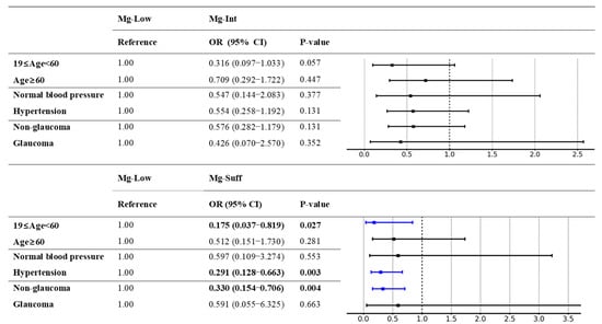 Forest plots of odds ratios for retinal vein occlusion associated with magnesium intake, stratified by age and presence of hypertension and glaucoma. Bold font for p-value and blue error bars in the forest plot indicate statistical significance. OR—odds ratio; CI—confidence interval.