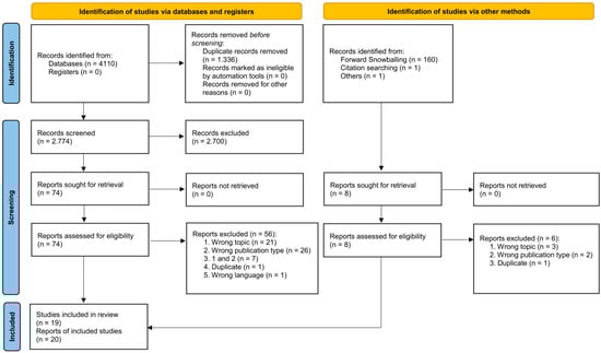 Figure 1 displays the literature search process, which initially yielded 4110 publications. After eliminating 1336 duplicates, the remaining 2774 publications were included in the title and abstract screening, of which 74 publications survived. Subsequent full-text screening excluded a further 56 studies, resulting in 17 studies reported in 18 publications eligible for inclusion in the systematic review. While forward snowballing did not identify additional studies, two more studies were found through the references of the already included studies [20,21]. This finally yielded 20 publications based on 19 distinct studies (Refs. [22,23] reported distinct results from the same study) that entered this systematic review. A list of all publications evaluated in the full-text screening that were excluded, together with the individual reason for exclusion, can be found in Supplementary Materials Table S3.