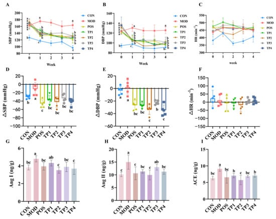 Comparative analysis of green tea peptides on reducing blood pressure, heart rate, and Ang I, Ang II, and ACE levels in kidneys of SHRs (n = 5). Levels of (A) SBP, (B) DBP, and (C) HR at weeks 0–4. Comparative analysis of (D) SBP difference (ΔSBP), (E) DBP difference (ΔDBP), and (F) HR difference (ΔHR) in green tea peptide gavaged rats at week 4 versus week 0. Changes in levels of (G) Ang I, (H) Ang II, and (I) ACE in kidneys of rats after four weeks of continuous gavage. Means denoted by different letter indicate significant differences between groups (p < 0.05).