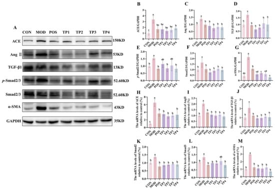 Weigh 40 mg of kidney tissue sample into a homogenate tube and homogenize with 400 μL of lysate (980 μL of radioimmunoprecipitation assay (RIPA, Beyotime, Shanghai, China), 10 μL of phenylmethanesulfonyl fluoride (PMSF), and 10 μL of Phosphatase Inhibitor Cocktail (Beyotime, Shanghai, China). Centrifuge the homogenate at 4 °C for 20 min at 18,506× g and collect the supernatant. The protein content in the supernatant was determined using Bidicinchoninic acid (BCA, Thermo, Waltham, MA, USA). An equal amount of each sample was mixed with a quarter volume of loading buffer 4× and denatured in a metal bath at 98 °C for 5 min. Proteins were separated using polyolefin-neutral gel electrophoresis (80–120 V) and then transferred to polyvinylidene fluoride (PVDF) membranes. At room temperature, seal for 2 h with 5% skim milk. After 2 h of shaking with 5% skimmed milk at room temperature, the primary antibody was prepared with a primary antibody dilution containing 5% bovine serum albumin (BSA). The specific antibody dilution ratios are listed as follows: Glyceraldehyde-3-phosphate dehydrogenase, Glyceraldehyde-3-phosphate dehydrogenase (GAPDH, CST, 5174S, Danvers, MA, USA, Rabbit, 1:1000), angiotensin-converting enzyme (ACE, Boster, PB9124, Wuhan, China, Rabbit, 1:1000), angiotensin II (Ang II, Bioss, bs-0587R, Beijing, China, Rabbit, 1:1000), transforming growth factor-β1 (TGF-β1, Boster, BA0290, Wuhan, China, Rabbit, 1:1000), Sma- and Mad-related proteins 2/3 (Smad2/3, CST, 8685S, Danvers, MA, USA, Rabbit, 1:1000), phosphorylated-Smad2/3 (p-Smad2/3, CST, 8828S, Danvers, MA, USA Rabbit, 1:1000), α-smooth muscle actin (α-SMA, Boster, BM0002, Wuhan, China, Mouse, 1:1000), medullary differentiation factor 88 (MyD88, CST, 4283S, Danvers, MA, USA, Rabbit, 1:1000), inducible nitric oxide synthase (iNOS, Abcam, ab15323, Cambridge, UK, Rabbit, 1:1000), and nuclear factor-κB p65 (NF-κB p65, CST, 8242S, Danvers, MA, USA, Rabbit 1:1000). The membrane was incubated overnight with the above-mentioned antibody at 4 °C and then incubated for 50 min by oscillating at 37 °C with the secondary antibody. After washing the film with TBST, add an electrochemical luminescence (ECL) reagent for 2–3 min. The films were exposed from 10 s to 5 min (exposure time was adjusted based on light intensity), and the bands were scanned and quantified for intensity using ImageJ software (Windows 64-bit). Results were normalized to the density of GAPDH bands.