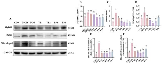 TGF-β1, through the Smad signaling pathway, not only induces fibrosis but also mediates inflammation. The MyD88/NF-κB p65/iNOS signaling pathway plays a key role in the inflammatory response, with activation of NF-κB further promoting an elevation in the concentrations of pertinent inflammatorycytokines [37]. Protein blotting revealed that the expression of MyD88, NF-κB p65, and iNOS was significantly upregulated in the kidneys of SHRs compared to WKY. Treatment with captopril and green tea peptides reversed these changes (Figure 4A–E). Regarding the gene expression of NF-κB p65 and iNOS, the overall trend was similar to the corresponding protein expression. These results suggested that green tea peptides inhibited hypertension-induced activation of the MyD88/NF-κB p65/iNOS signaling pathway in rat kidneys, with TP2 showing the most significant effect on mitigating renal inflammation.
