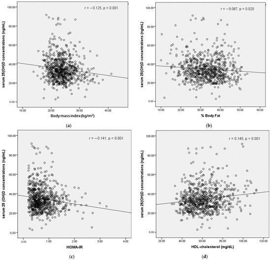We further explored the relationship between vitamin D status and body composition. Serum 25(OH)D concentrations were negatively associated with weight (r = −0.129, p = 0.001), BMI (r = −0.125, p = 0.001), body fat mass (r = −0.128, p = 0.001), %body fat (r = −0.087, p = 0.020), visceral fat area (r = −0.101, p = 0.007), insulin (r = −0.141, p < 0.001), and HOMA-IR (r = −0.141, p < 0.001). In contrast, 25(OH)D levels were positively correlated with age (r = 0.100, p = 0.007) and HDL cholesterol (r = 0.145, p < 0.001) (Figure 1). However, no significant association was observed between vitamin D status and cognitive function, as measured by MMSE and MoCA scores.