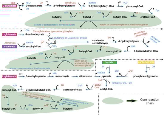 Butyrate also acts as an inhibitor against a class of enzymes named histone deacetylases [23]. Histone deacetylases (HDACs) act by removing the ε-N-acetyl groups from lysine residues leading to the formation of a condensed and transcriptionally silent chromatin by allowing the histones to wrap the DNA more tightly [24,25]. Among the SCFAs, butyrate is the most potent in inhibiting HDAC activities both in vitro and in vivo [26]. Butyrate can be metabolized through two pathways: The first involves butyryl-CoA/acetate CoA transferase, while the second utilizes phosphotransbutyrylase-butyrate kinase [27]. Additionally, in the first pathway, butyrate is produced through glycolysis of carbohydrates, leading to the formation of acetoacetyl-CoA by combining two molecules of acetyl-CoA, which is then reduced to form butyryl-CoA [27]. Microbial pathways for butyrate formation from carbohydrates, organic acids, and glutamate are depicted in Figure 1, while glutamate and lysine in gut communities are illustrated in Figure 2. The green core reaction chain indicates a common phase in the metabolic reactions leading to butyrate production. Here, H signifies redox reactions, CoA refers to coenzyme A, P denotes bound phosphate, Pi represents inorganic phosphate, and (B12) indicates enzymes dependent on vitamin B12.