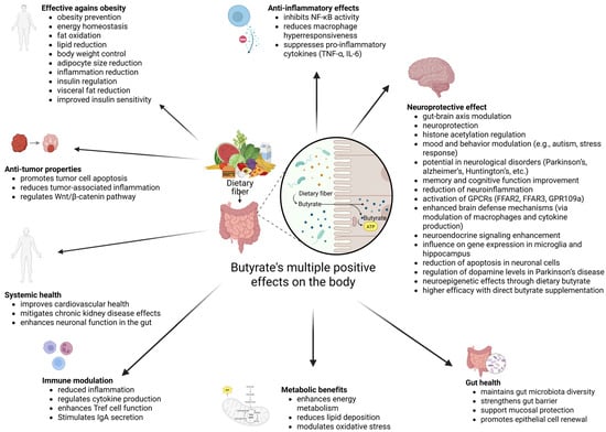 Sodium butyrate demonstrates markedly superior immunological and neurological benefits when compared to butyrate derived from a high-fiber diet. This amplified effectiveness is likely due to the direct administration of sodium butyrate in higher doses, while dietary butyrate generally affects brain function through gut-related pathways. Current literature emphasizes the importance of the gut–brain axis and nutrition in both disease development and treatment. To better understand the potential benefits, future research should explore the neuroepigenetic effects of dietary butyrate more thoroughly. The dose–response relationship should be examined more precisely in future studies to determine how much specific butyrate actually reaches the brain. Such research could reveal the therapeutic potential of butyrate more clearly. Additionally, the synergistic effects of various types of dietary fiber and fermented foods should be considered, as their combination could significantly increase butyrate levels and optimize its benefits. In Table 3, we can see some investigations that indicate the relationship between butyrate and neurological effects in models. Figure 3 presents a diagram displaying the multiple positive effects of butyrate on body health.