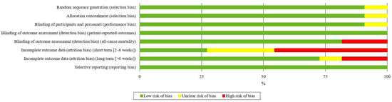 The distinct aspects reviewed were classified into several domains: random sequence generation (selection bias), allocation concealment (selection bias), blinding of participants (implementation bias), blinding of outcome assessment (detection bias), incomplete outcome data (attrition bias), selective reporting (reporting bias), and other types of biases. They were categorised as ‘low’ if they met the criteria for negligible risk of bias (plausible bias unlikely to seriously alter the results) or ‘high’ if they met the criteria for substantial risk of bias (plausible bias that seriously undermines confidence in the results). If the risk of bias was unknown, it was considered ‘unclear’ (plausible bias that raises some doubt about the results) [44].