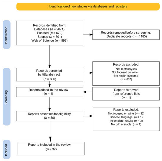 From the initial search on three different databases (Scopus, Web of Science, PubMed), 2071 articles were identified. After the removal of duplicates (n = 1185), 886 articles remained for the title and abstract analysis (Figure 1). After the initial screening, 837 studies were excluded because they did not meet the necessary inclusion criteria. One additional study, retrieved from the latest conducted meta-analysis, was added to the remaining forty-nine studies. After evaluating the full texts of the 50 selected articles, 18 studies were excluded, leaving a total of 32 studies eligible for meta-analysis [33,34,35,36,37,38,39,40,41,42,43,44,45,46,47,48,49,50,51,52,53,54,55,56,57,58,59,60,61,62,63,64] (Figure 1). The list of the excluded articles [65,66,67,68,69,70,71,72,73,74,75,76,77,78,79,80,81,82] with the reasons for exclusion is available in Table S2 of the Supplementary Materials.